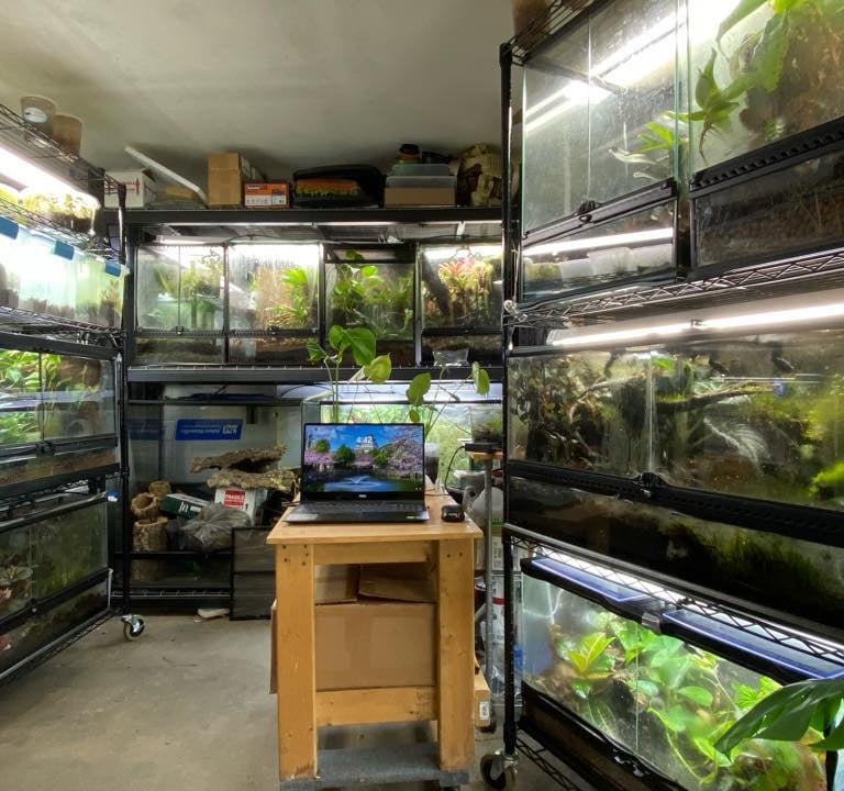 Life went a different direction, and I rehomed all my animals until my son turned 18 and brought home his first adult pet, a chameleon! This instantly sent me headfirst back into the dart frog world. Once my frog room was dialed in, I thought, "Why not add crested geckos?" This question then turned into an exclamation: "Look at the amazing gecko creations I can make!" Anyone passionate about the hobby knows that from such a realization comes only the long drop down the rabbit hole!