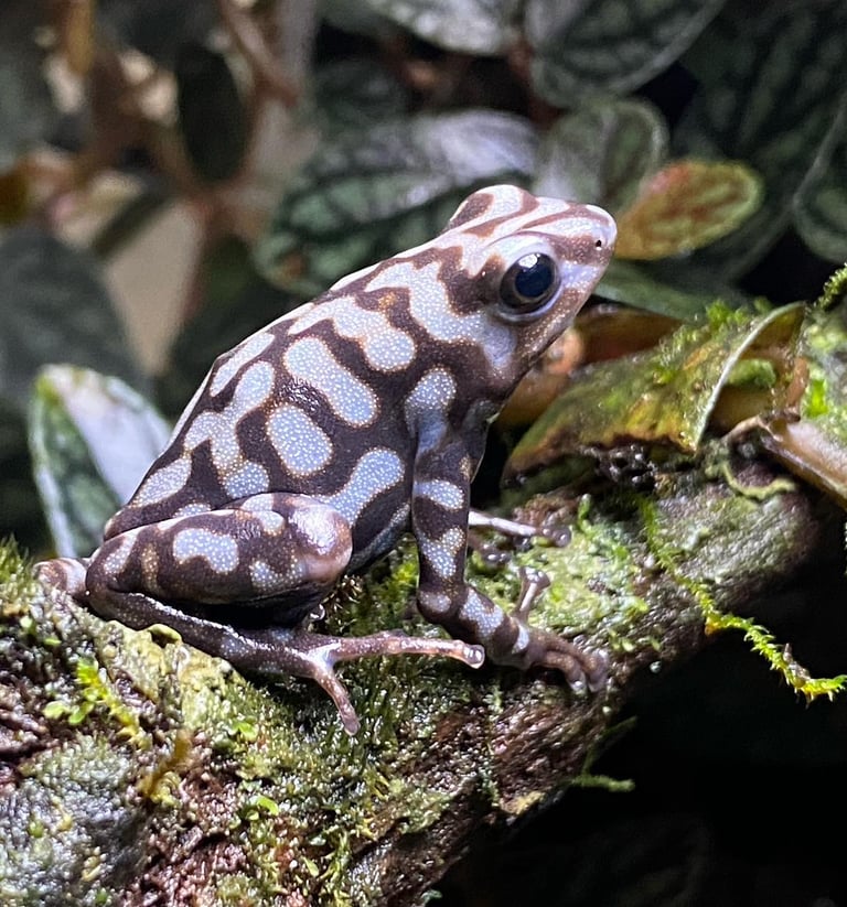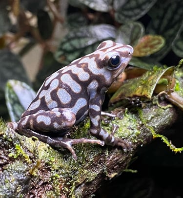 Dendrobates auratus "Pena Blanca" start as a dull brown and blue and turn into white and black patterned with metallic bronzing. Some might even suggest a purple tinge. Perfect for beginners in terms of care, but it tends to be a shy frog. They will get bolder with age and exposure. They have a quiet call. Females are larger measuring in at approximately 1.5" and males are approximately 1.25" at maturity.