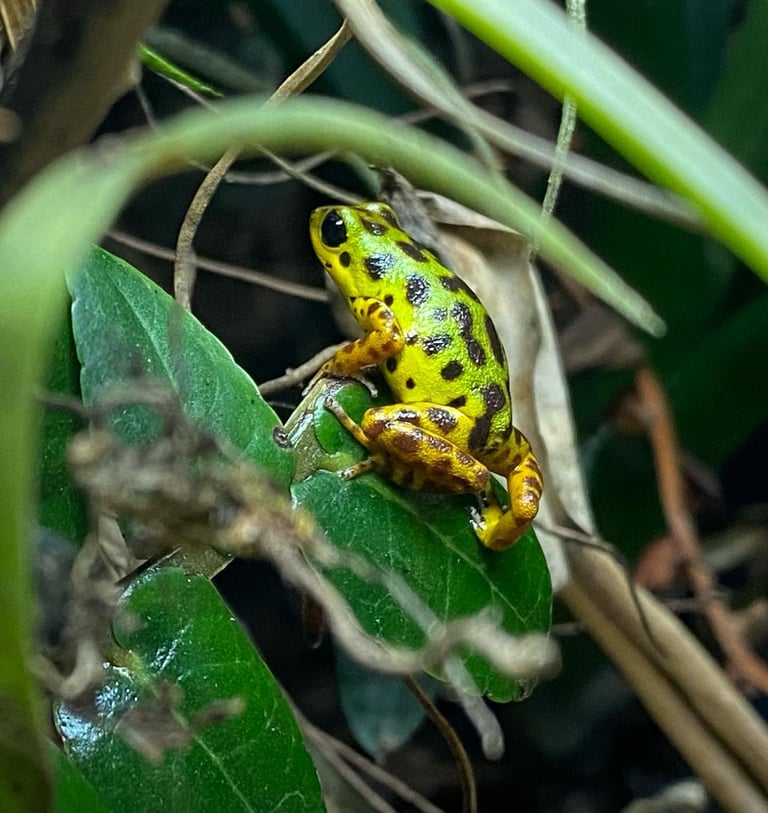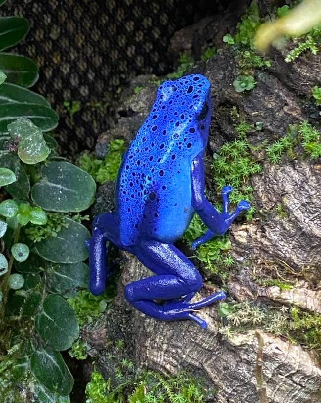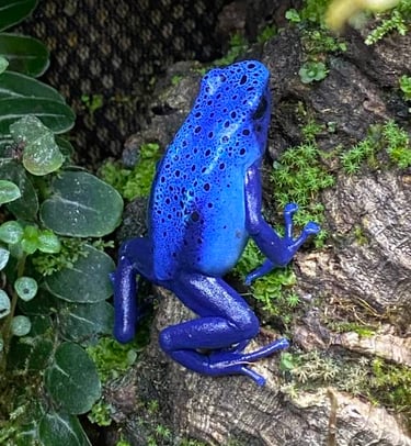 This frog is perfect for beginners just getting into the hobby! This was one of my firsts. Dendrobates tinctorius "Azureus" is a blue poison dart frog with varying black spots. These bold frogs have a quiet call. They are a larger frog: females are approximately 2" and males averaging about 1.5" at maturity.