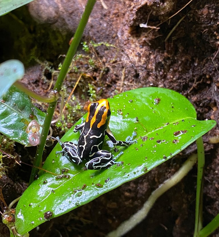 Ranitomeya fantastica "Lowland" are copper, yellow, blue, and black. They are a thumbnail frog with a quiet call. Mature females and males are similar in length, measuring in around 3/4".